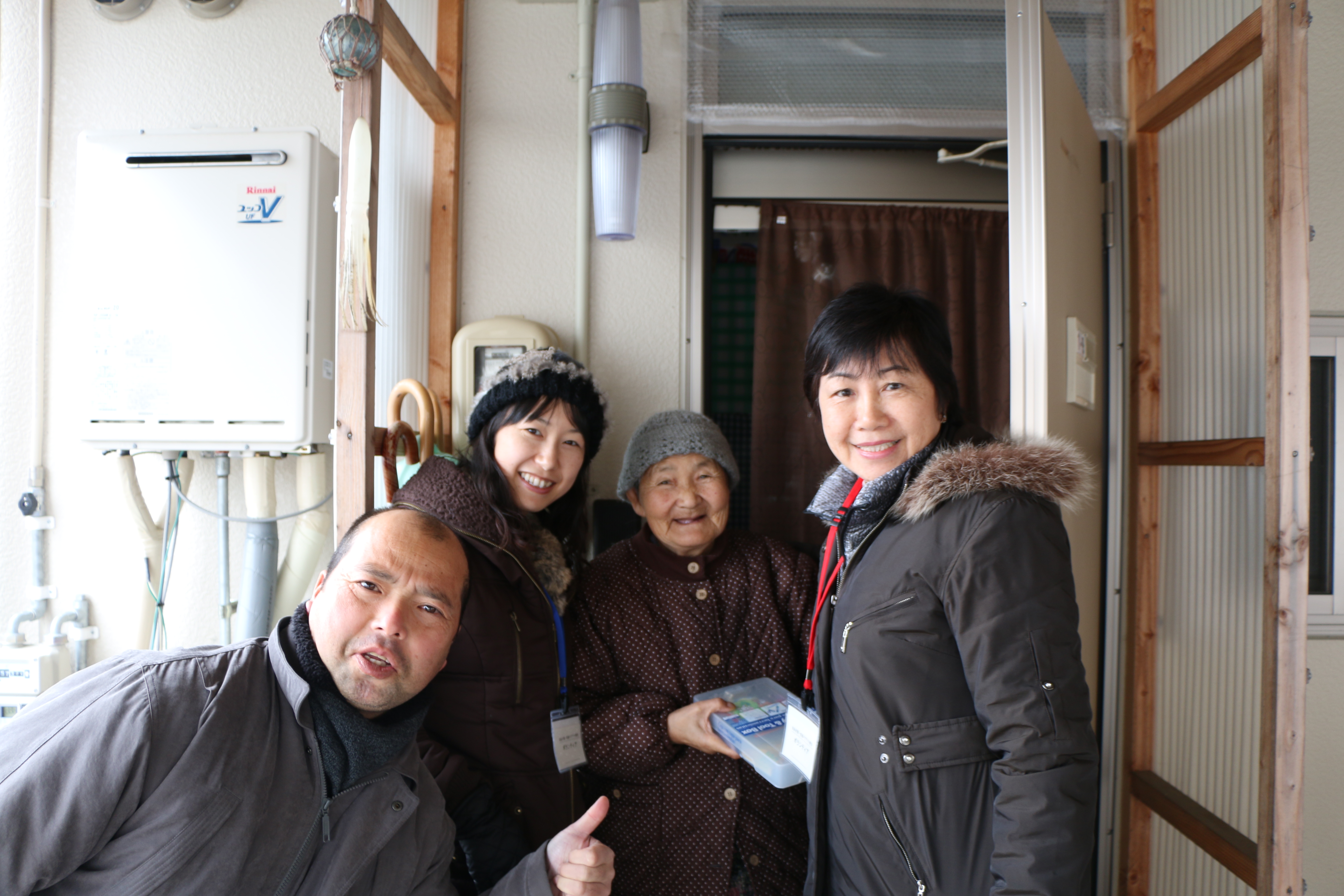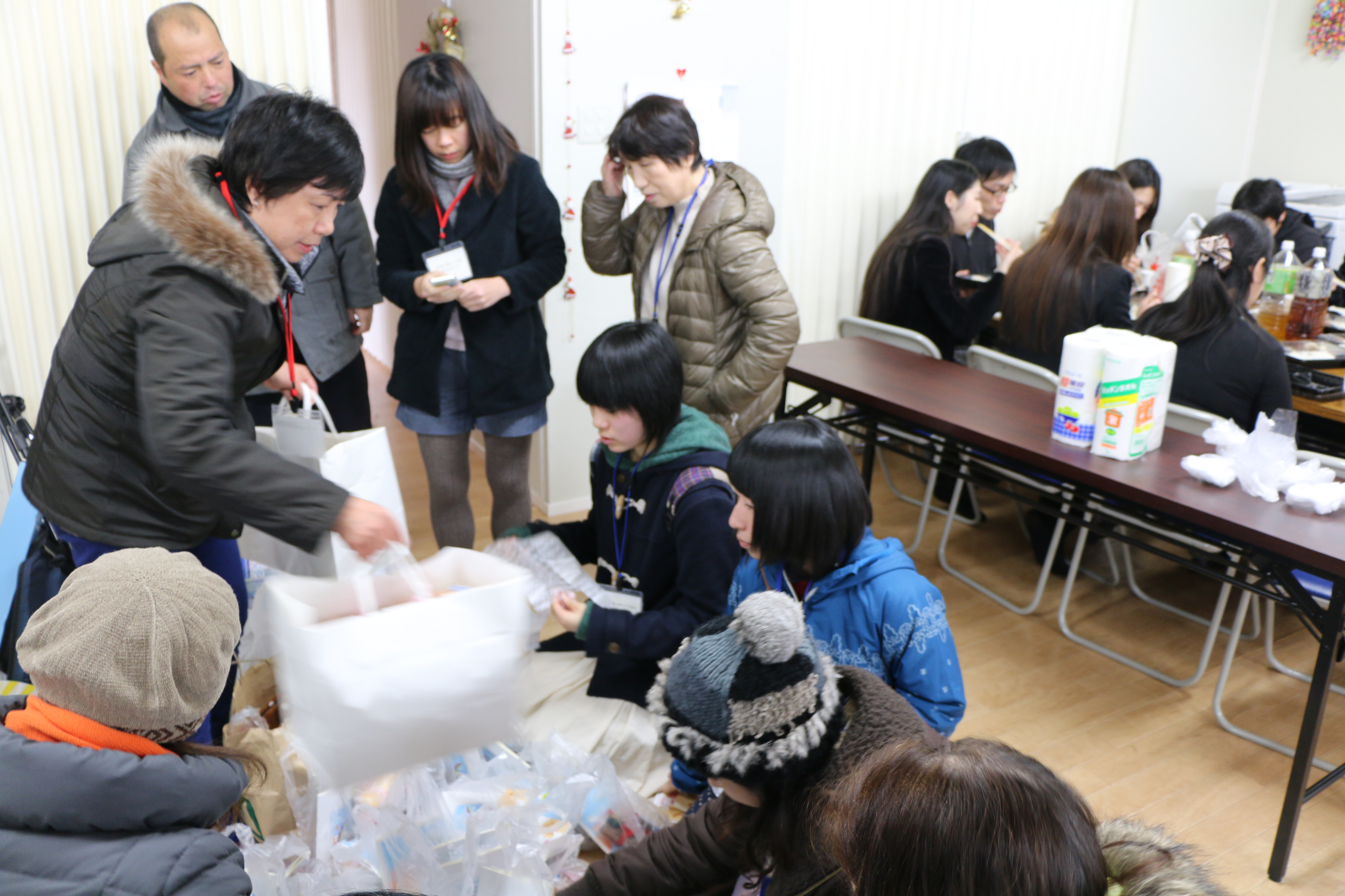Recently , we visited 2 Kasetsujyutaku to gave out Christmas cakes and gifts to children . We are going to visit certain Kasetsujyutaku on a regular basis to serve the people and have a good relationship with them. Last week we got to befriend 2 senior high school students and they were so happy to join us visit the people at the Kesetsu. We hope to take some volunteers from Sendai join us in our ministry in Kesennuma too. ( we need more Japanese speaking volunteers ).